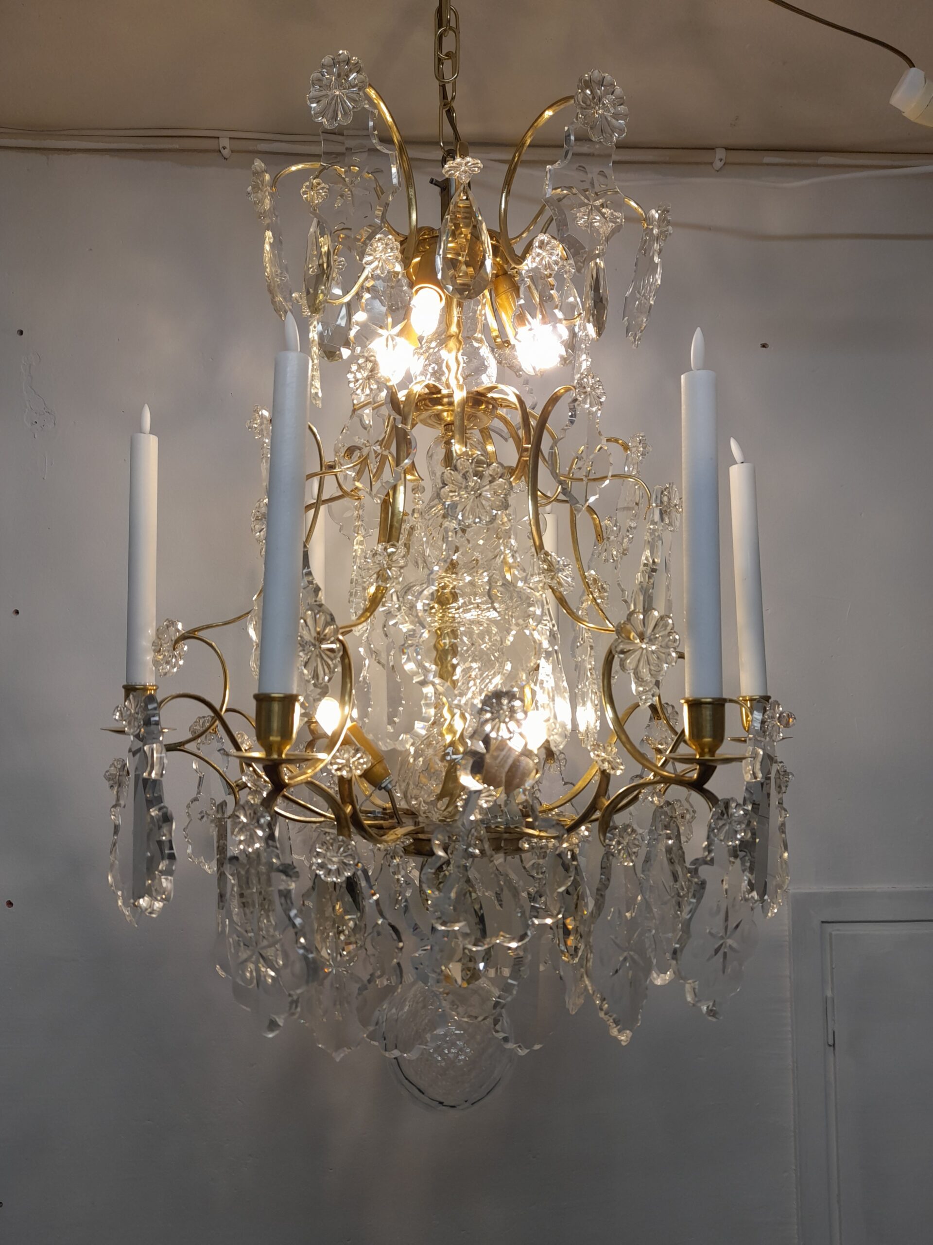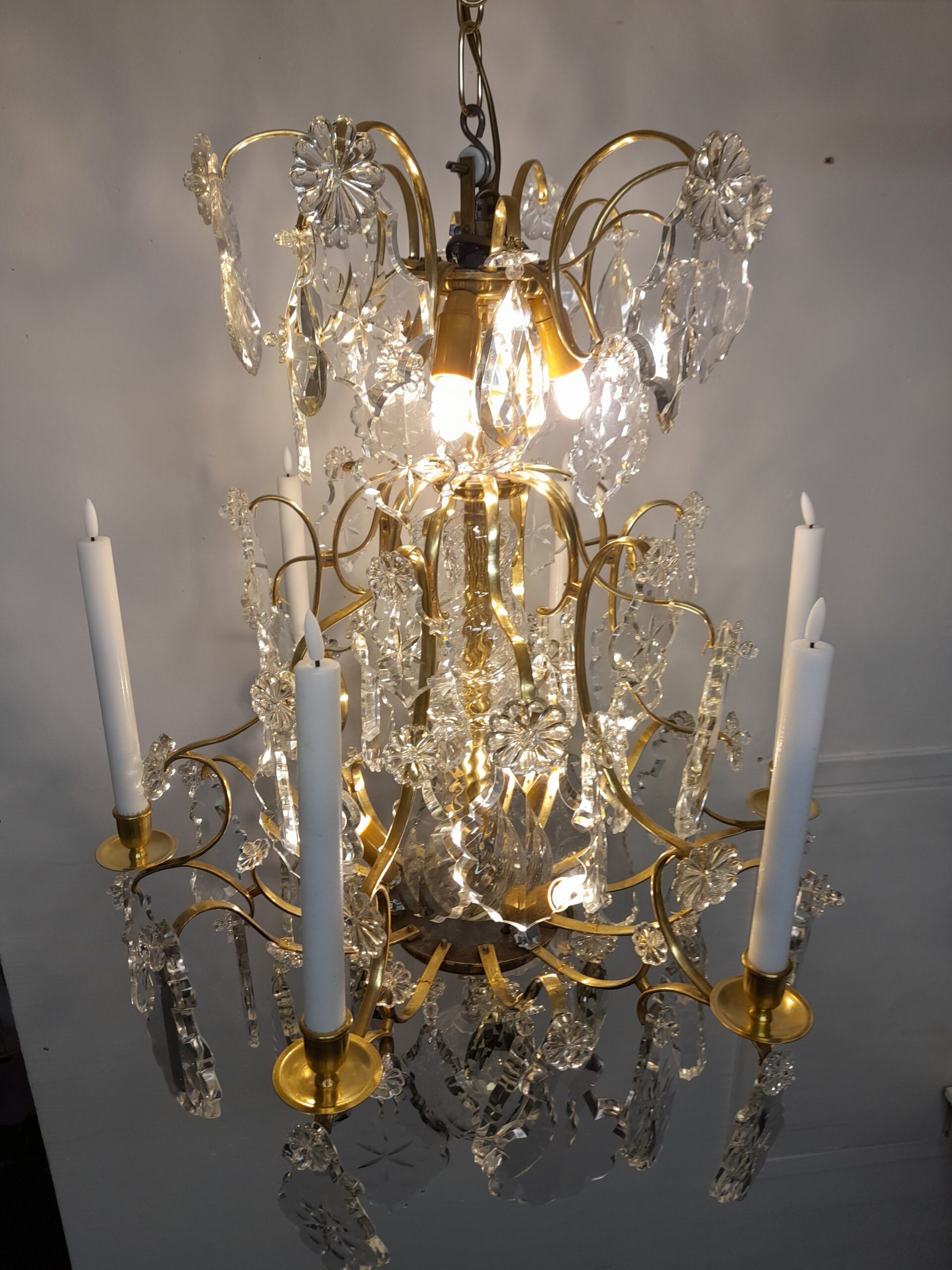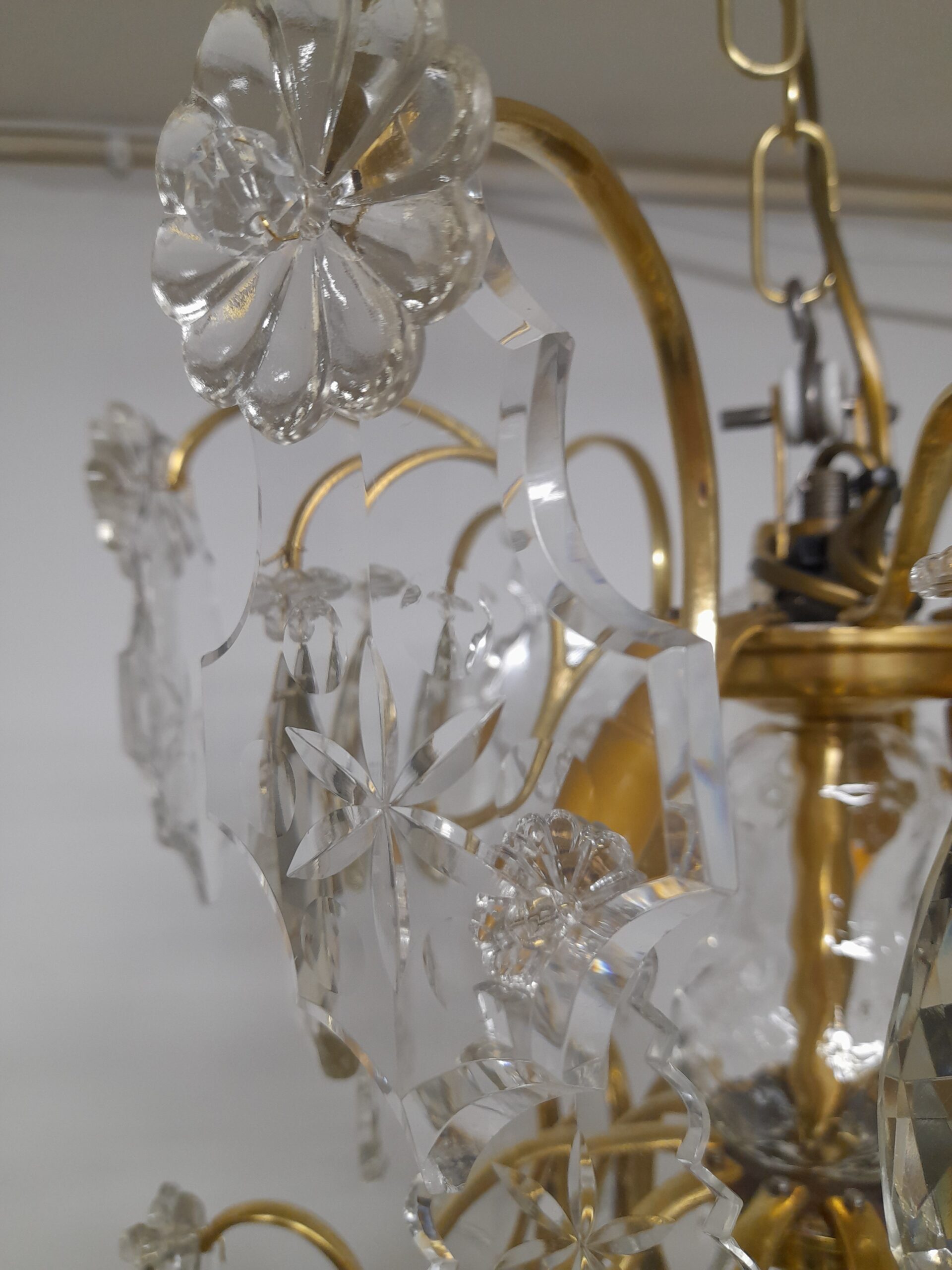 En antik 6 armad ljuskrona i rokokostil sent 1800-tal. Behängd med härligt unika graverade löv prismor med tillhörande margueriter. Stomme i solid mässing. 6 st E14 el punkter. Höjd 80 cm. Diameter: 56 cm.