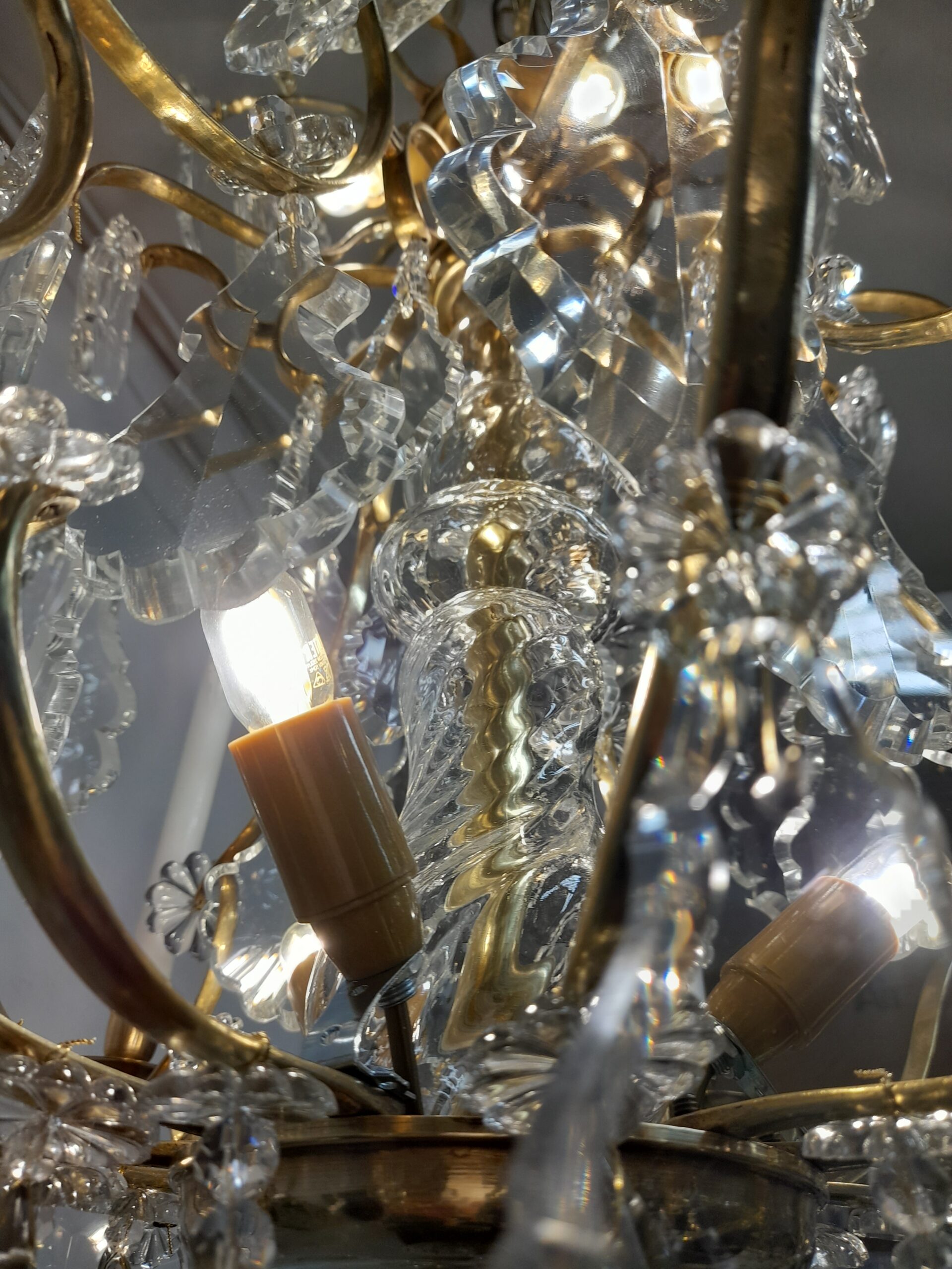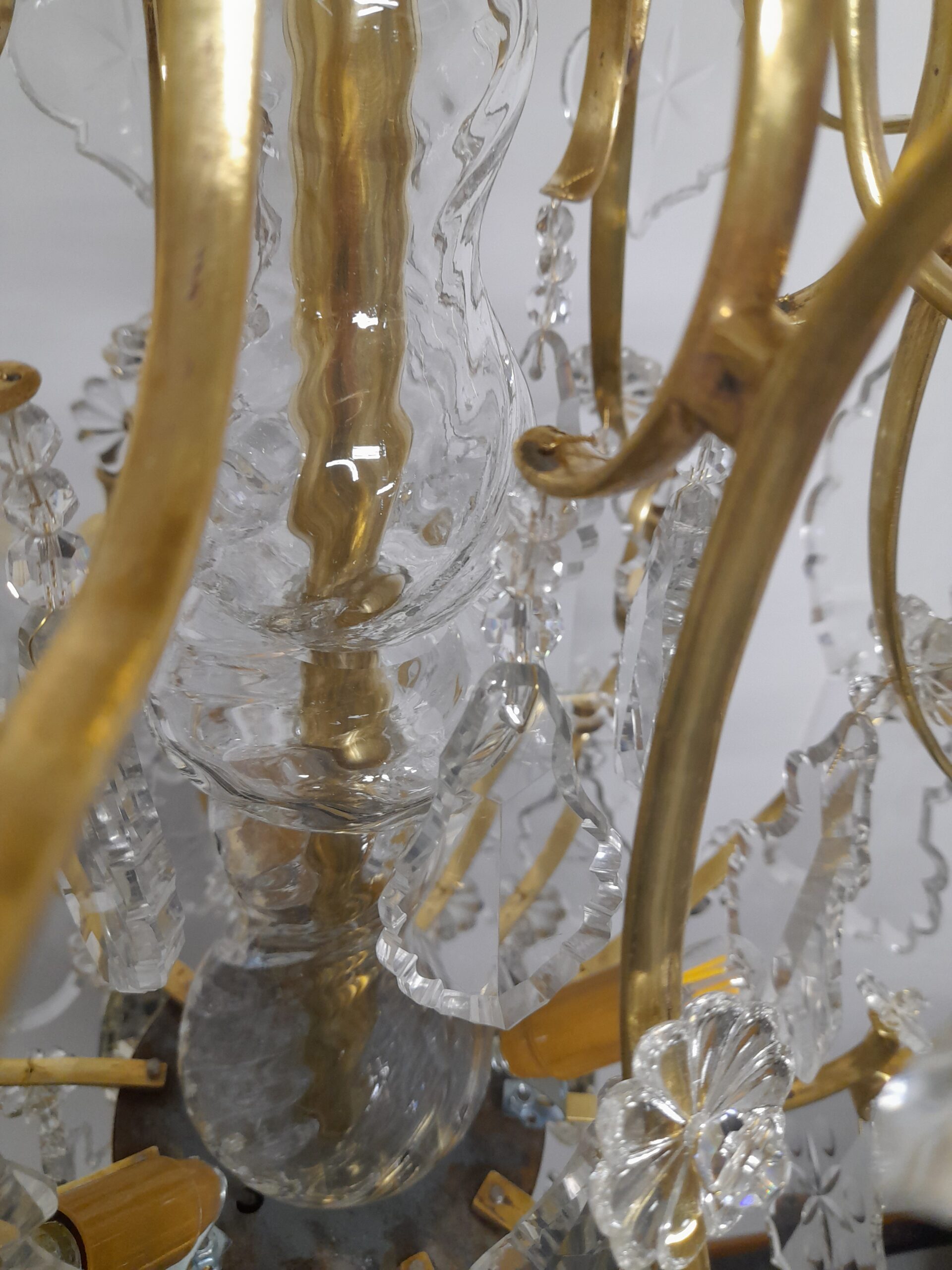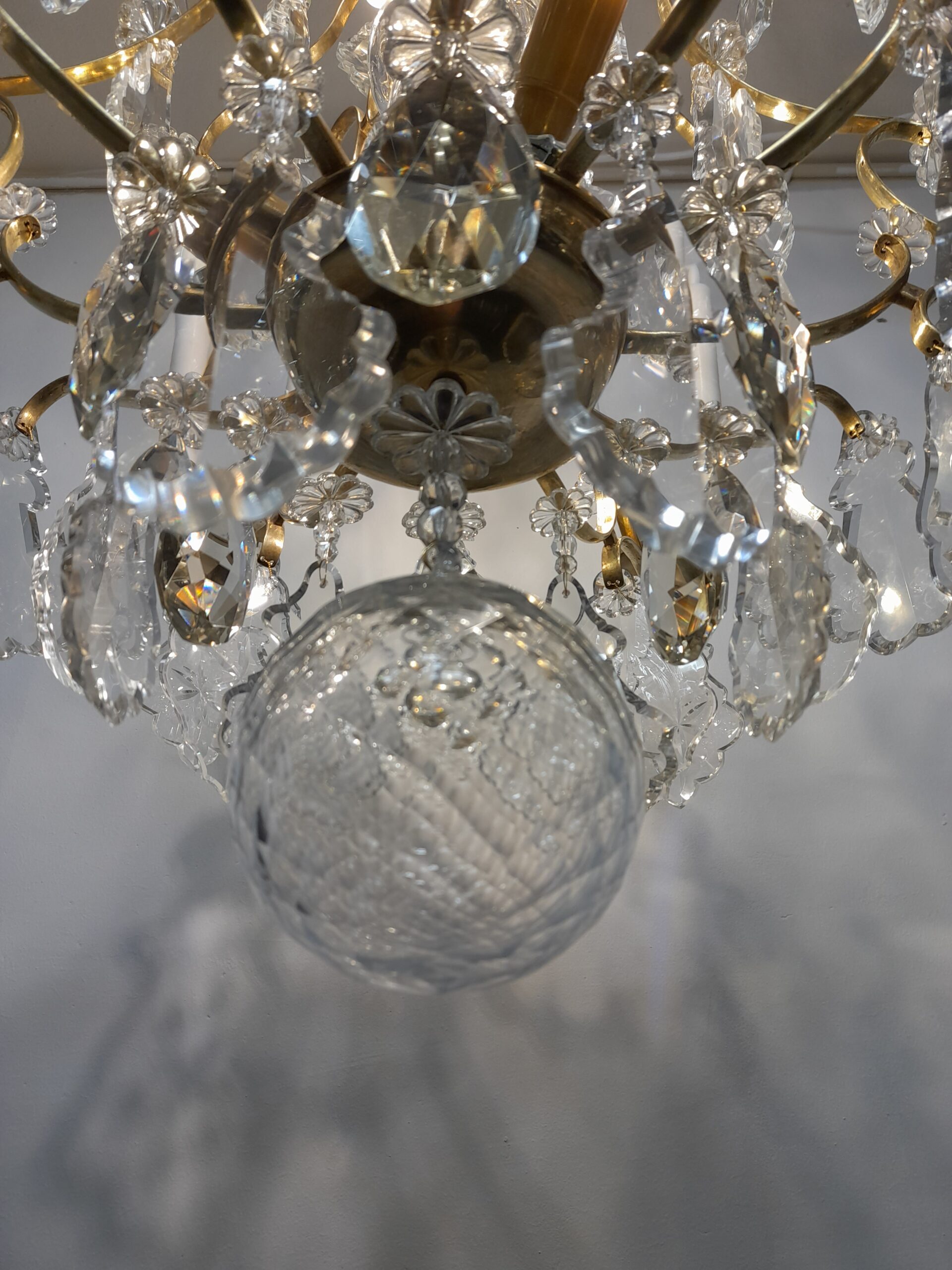 En antik 6 armad ljuskrona i rokokostil sent 1800-tal. Behängd med härligt unika graverade löv prismor med tillhörande margueriter. Stomme i solid mässing. 6 st E14 el punkter. Höjd 80 cm. Diameter: 56 cm.