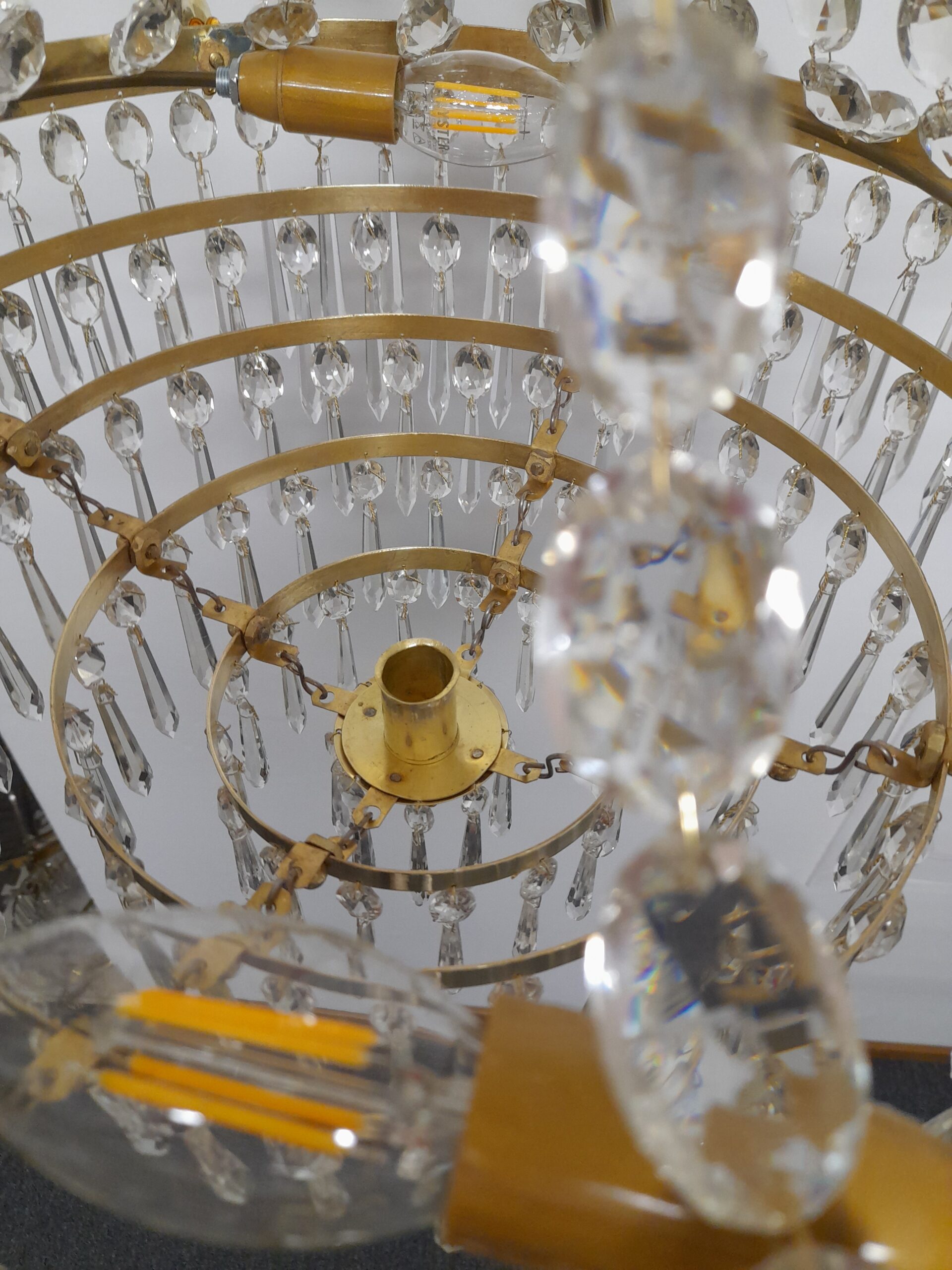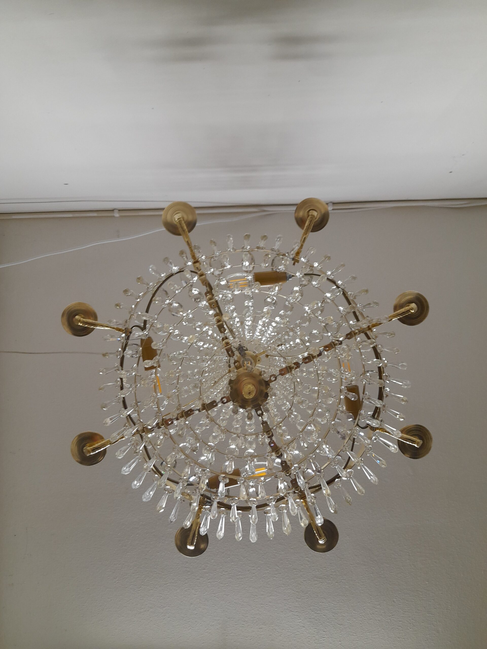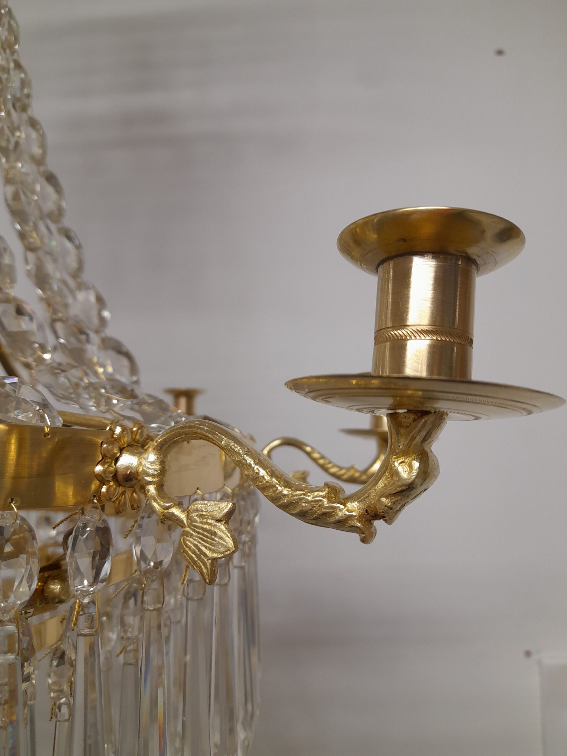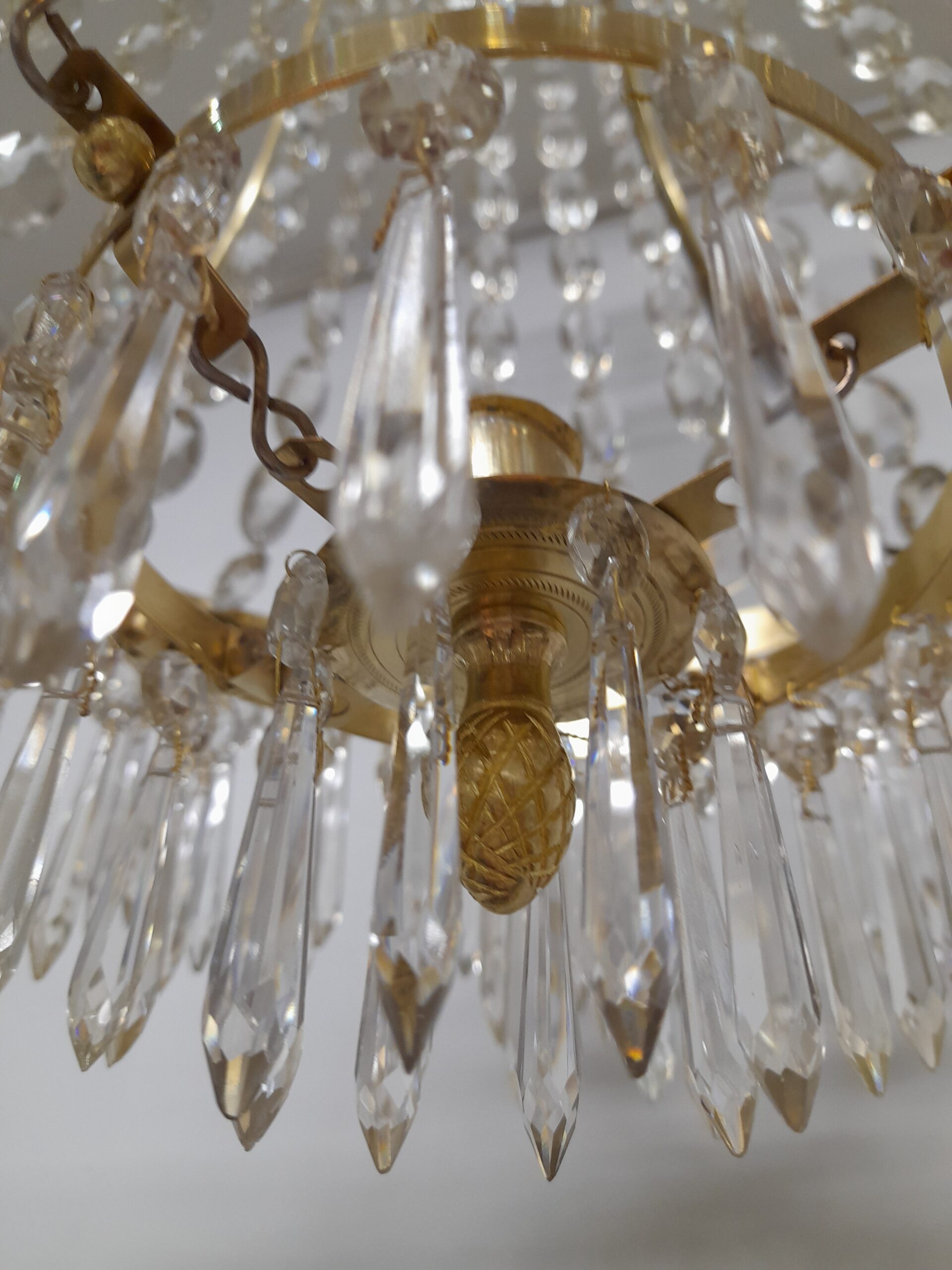 Ljuskrona i “Karl Johan” stil. 1800-tal. 8 st ljusarmar i liggande form av fiskmotiv. Plats för 9 st levande ljus då kronan har ett s.k sparljus centrerat i kronans botten. Stomme med fin patina i handarbetad mässing. Ramverk utsmyckad med blommor i mässing. Behängd med kedjor av “buchtel” prismor. Kronring med stjärnor och spjut prismor. Kronan avslutas med en tät behängd s.k “piggbotten” . Flera våningar med olika storlekar på spjut prismor av högsta kvalitet. 5 st el punkter ( E14) varav 1 elpunkt i kronans överdel. Höjd 85 cm, Diameter 67 cm.