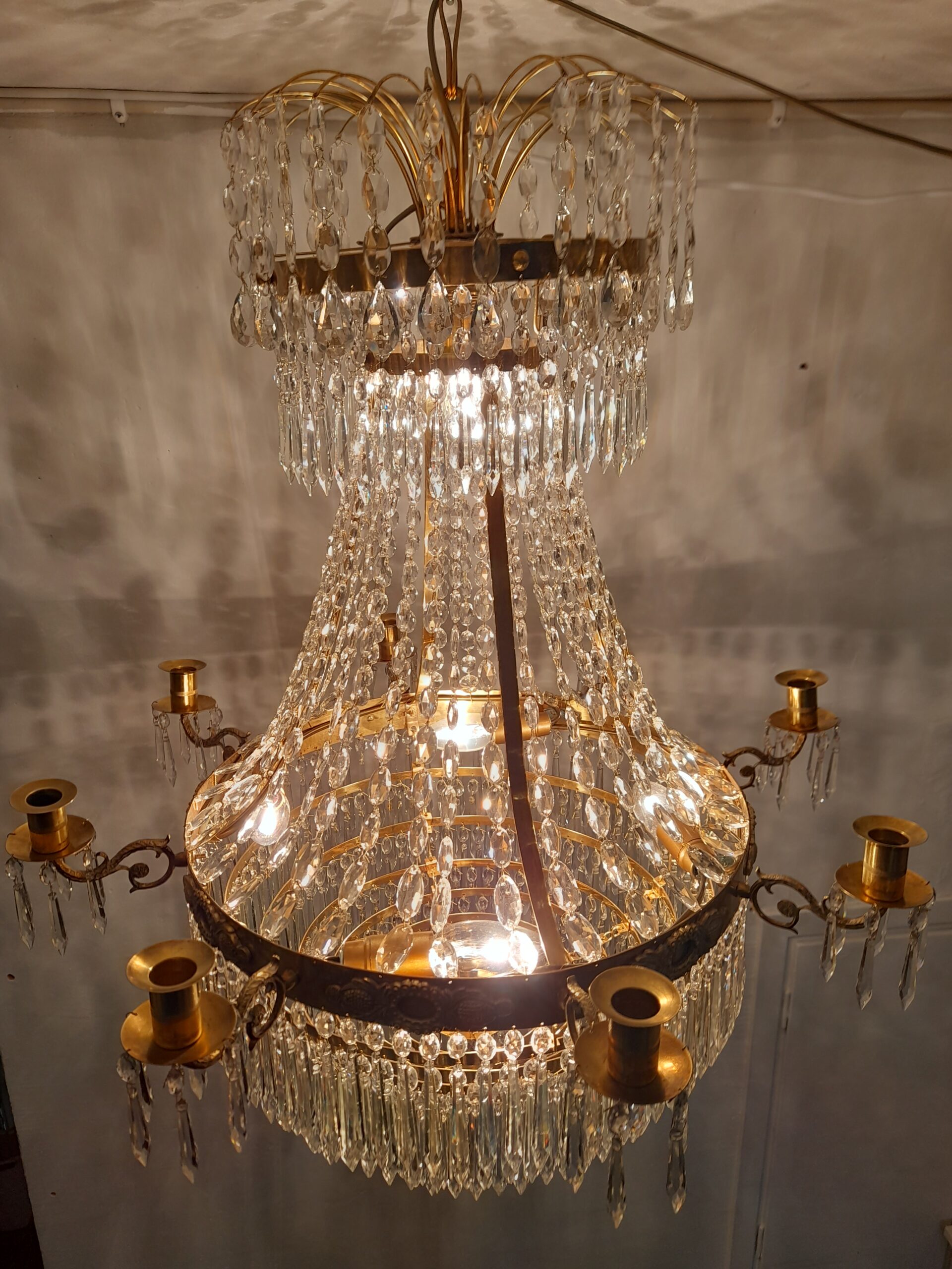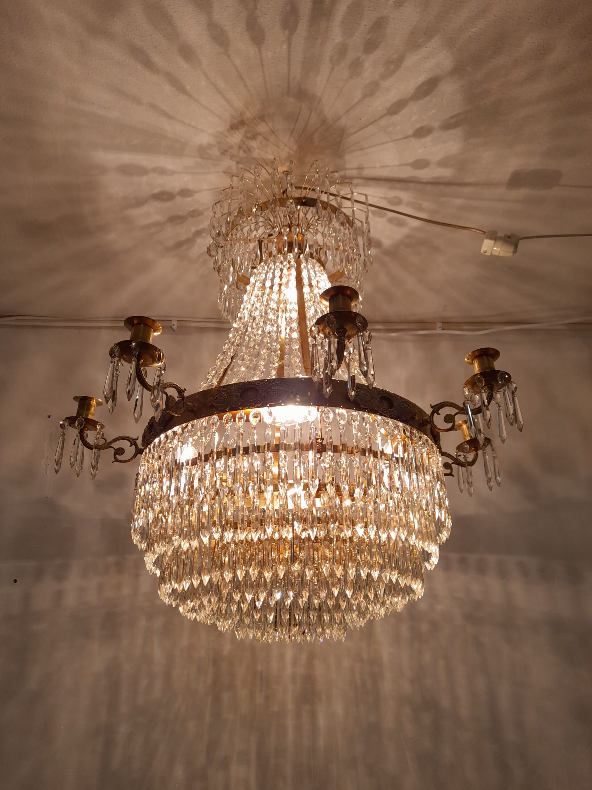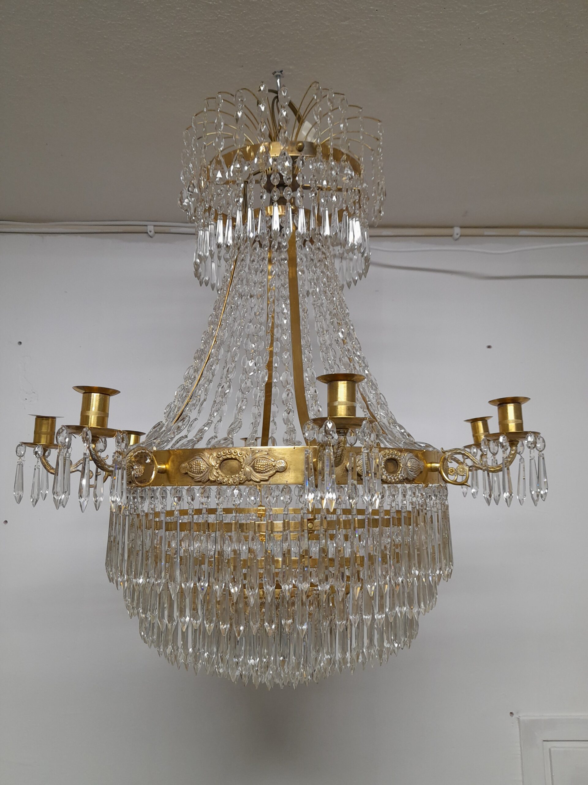 UNIK tät Ljuskrona i Empire stil. 1800-tal. 8 st ljusarmar. Plats för 9 st levande ljus då kronan har ett s.k sparljus centrerat i kronans piggbotten. Stomme med fin patina i handarbetad mässing. Ramverk utsmyckad med bladverks ornament i mässing. Behängd med kedjor av “buchtel” prismor. Kronring med stjärnor och spjut prismor. Kronan avslutas med en tät behängd s.k “piggbotten” . Flera våningar med en STOR mängd spjut prismor av hög kvalitet. 5 st el punkter ( E14). Höjd 76 cm, Diameter 65 cm.