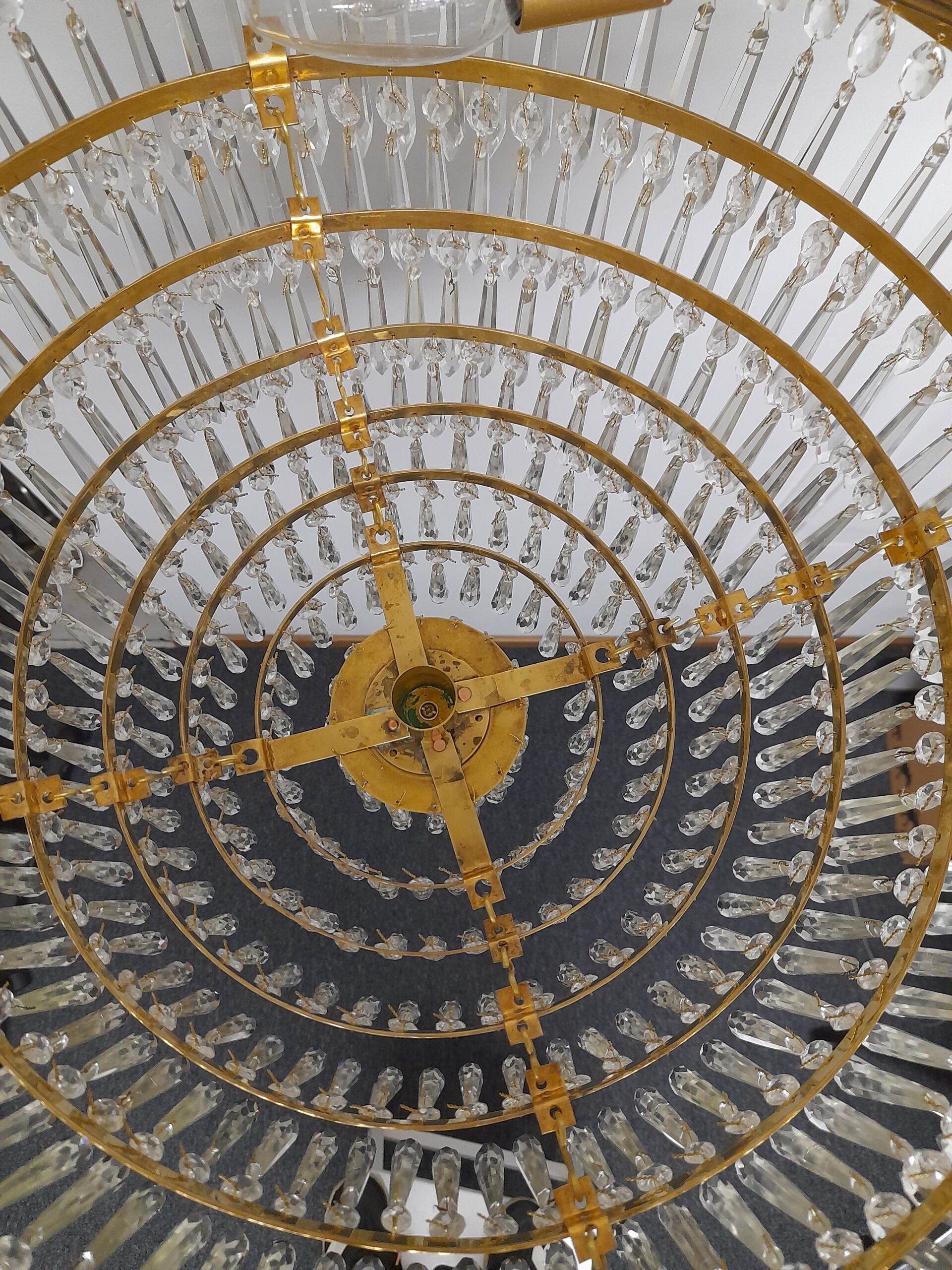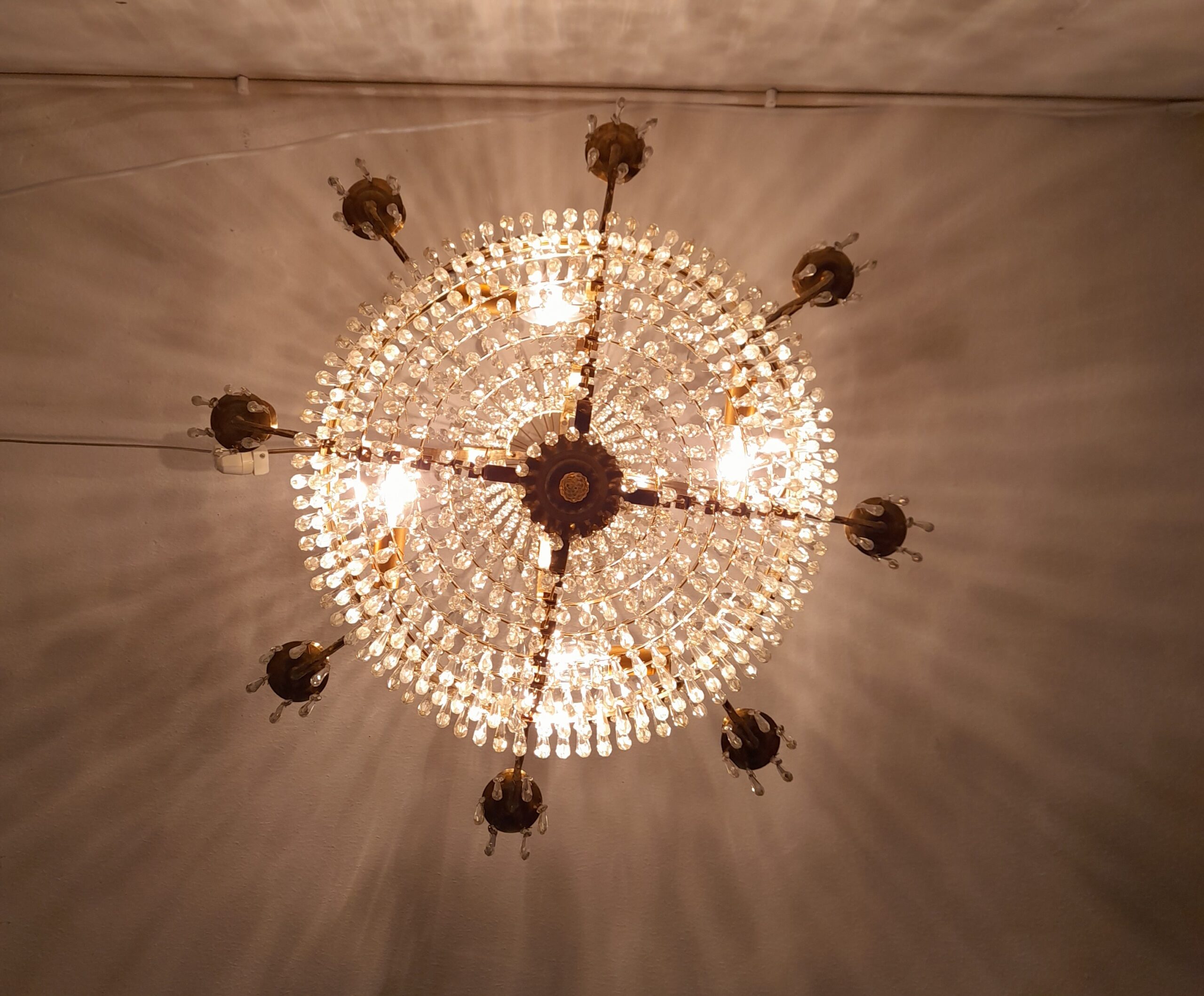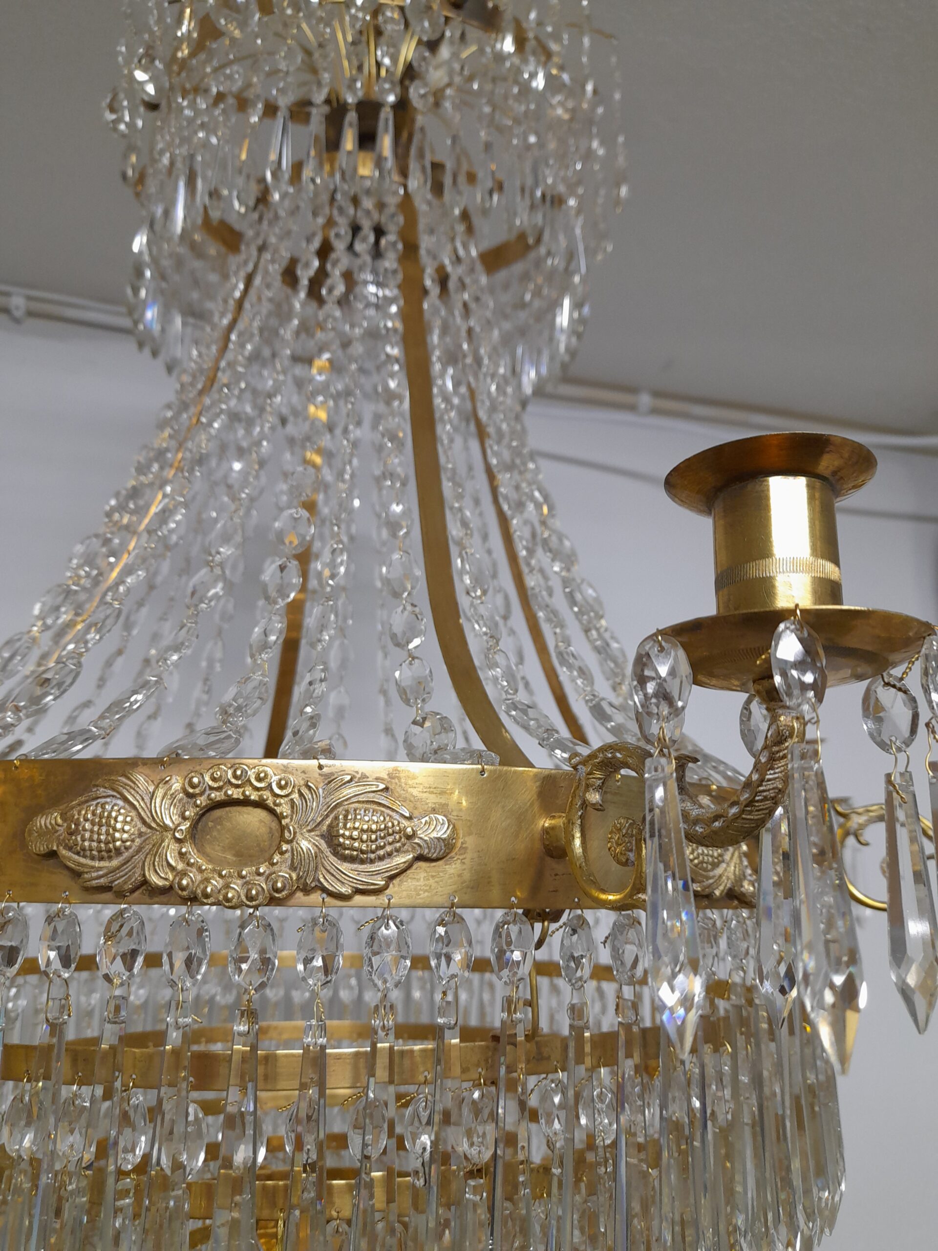 UNIK tät Ljuskrona i Empire stil. 1800-tal. 8 st ljusarmar. Plats för 9 st levande ljus då kronan har ett s.k sparljus centrerat i kronans piggbotten. Stomme med fin patina i handarbetad mässing. Ramverk utsmyckad med bladverks ornament i mässing. Behängd med kedjor av “buchtel” prismor. Kronring med stjärnor och spjut prismor. Kronan avslutas med en tät behängd s.k “piggbotten” . Flera våningar med en STOR mängd spjut prismor av hög kvalitet. 5 st el punkter ( E14). Höjd 76 cm, Diameter 65 cm.